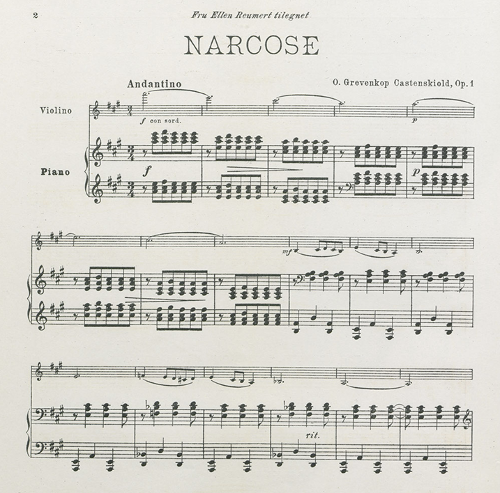 I 1919 debuterede en dansk adelsdame som komponist. Den 36-årige hofjægermesterinde Olga Grevenkop Castenskiold fra herregården Store Frederikslund præsenterede sit opus 1 for violin og klaver, og det var et værk med et usædvanligt erotisk indhold. Stykket havde den franske titel Narcose, hvad der i denne sammenhæng bedst kan oversættes til “Sansebedøvelse”. Undervejs i stykket angiver komponisten, at musikken skal spilles med “Eccitazione” (ophidselse), “Esaltazione” (eufori) og ende i “Estasi sonnolente” – døsig ekstase!